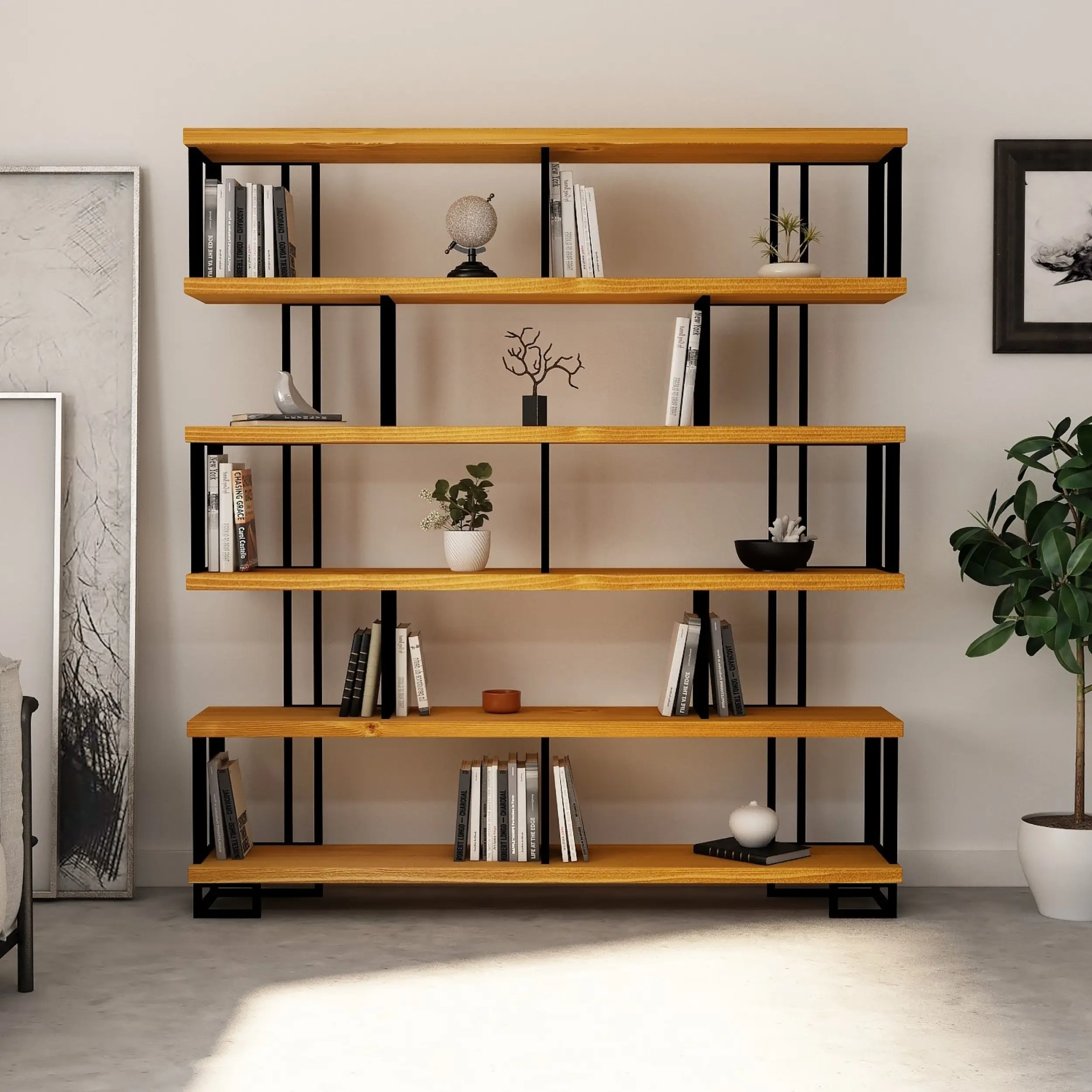 Farklı renk seçeneğine sahip masif ahşap rafları ve dar metal rafları ile harika bir görünüme sahip.