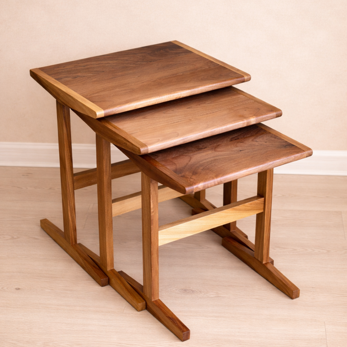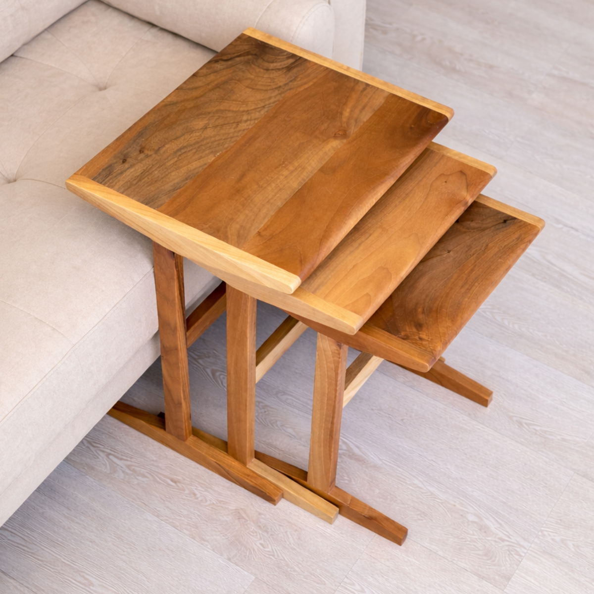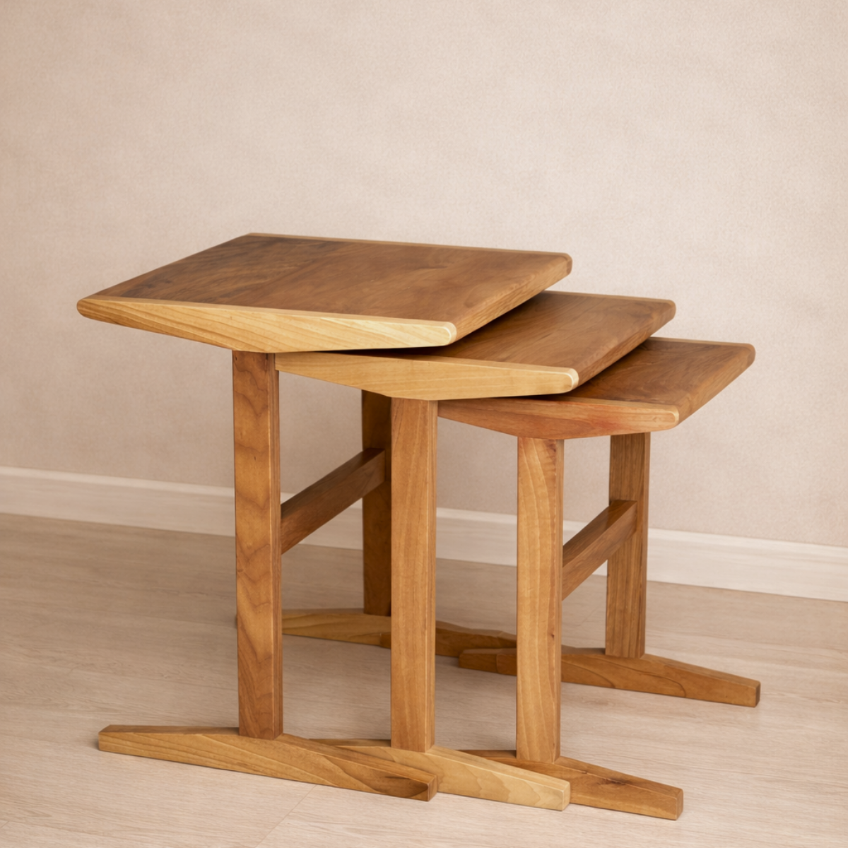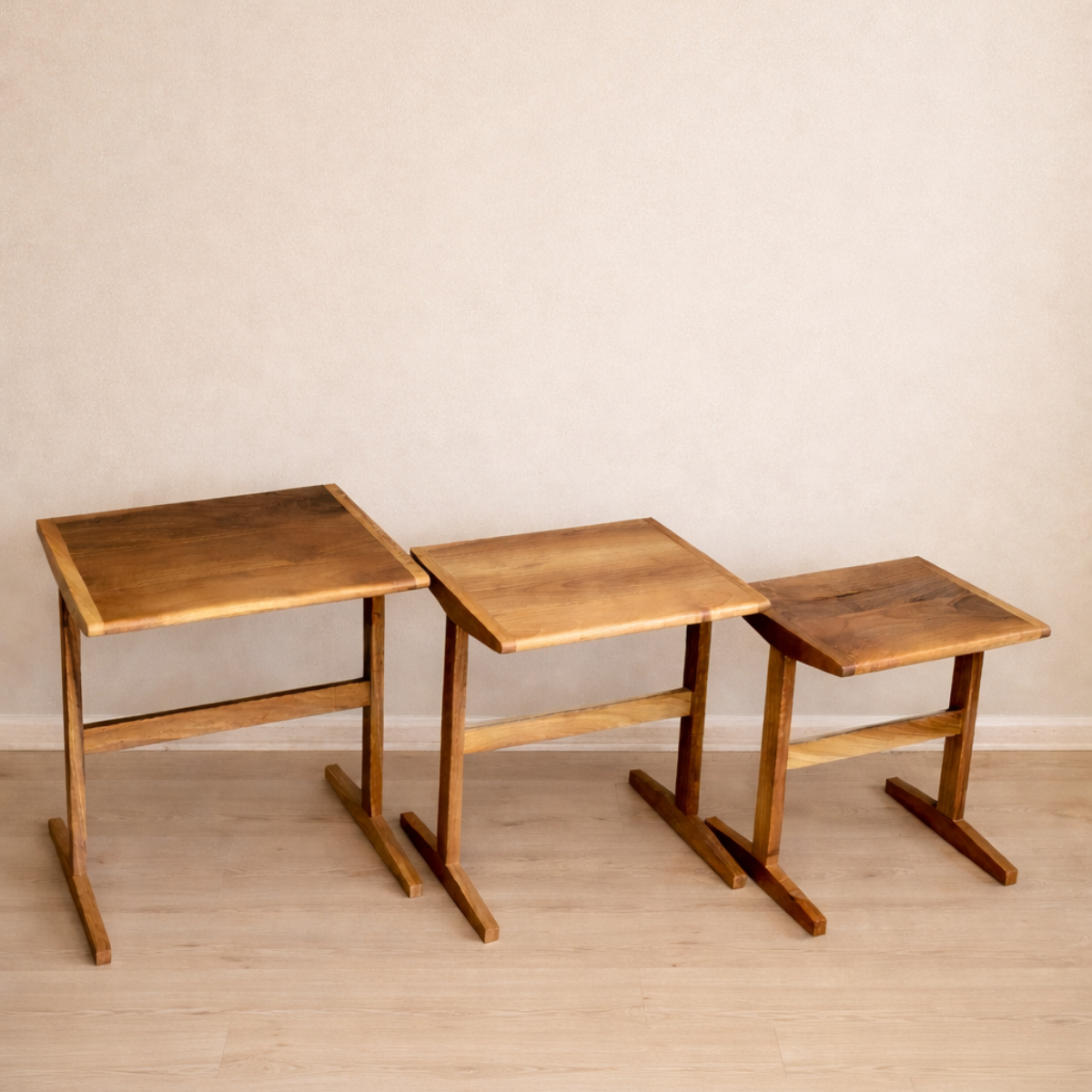 %100 masif ceviz ağacından üretilen Trio Masif Ceviz Zigon Sehpa seti, doğal dokusu ve sıcak tonlarıyla yaşam alanınıza şıklık katar. Farklı boyutlardaki üç sehpa iç içe geçerek yer tasarrufu sağlarken, misafirleriniz için pratik bir kullanım sunar. El işçiliğiyle şekillendirilen yuvarlatılmış köşeleri ve sağlam ayak yapısı, hem estetik hem de dayanıklılık sunar. Oturma odası, salon veya misafir alanları için zamansız bir tamamlayıcıdır.